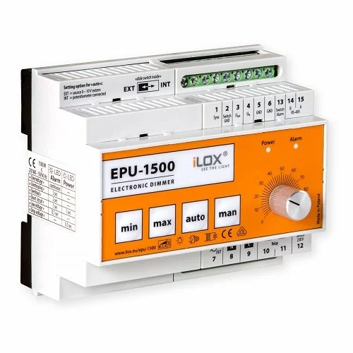 Універсальний димер контролер EPU-1500. Контролер яскравості 230 В змінного струму. Передбачено для різних типів навантажень: світлодіодні лампи, CFL або лампи розжарювання. Управління яскравістю через сигнал 0-10 В або інтерфейс RS 485 (MODBUS-RTU). Кілька контролерів підключаються по групах для досягнення більш високої продуктивності. Тривожні звіти по светодиодам: перегрів, перевантаження, коротке замикання, низька напруга; діммірованіе м'якого пуску; гнучке налаштування MIN / MAX; симуляція Sunset / Sunrise (годинник зовнішнього перемикача); цифрове управління затемненням колірних лампочок RGB (W).