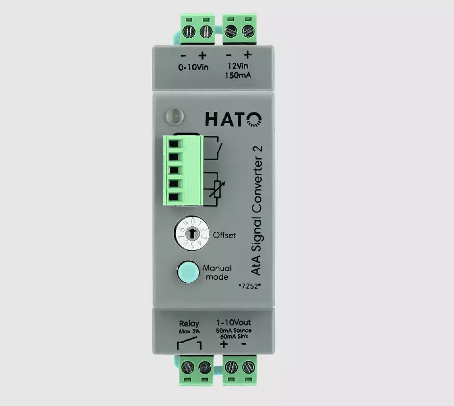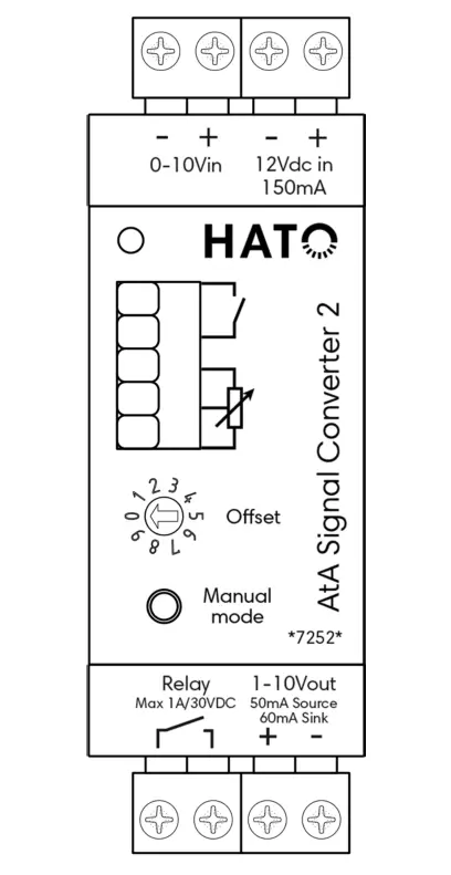 Преобразователь сигнала AtA 2 преобразует сигнал регулировки яркости ламп 0–10 В в сигнал 1–10 В. Можно задать смещение, чтобы гарантировать включение света при 10 % (вход 1 В).